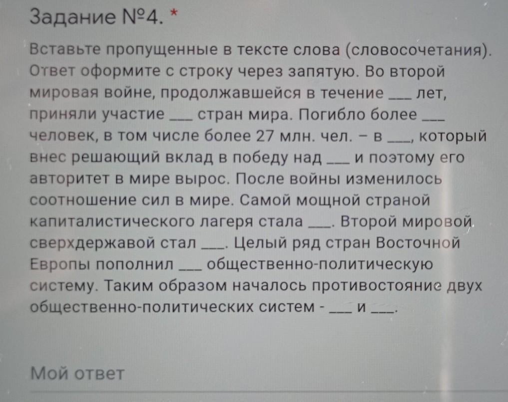 в течении 6 лет, более ста стран мира, погибло более 60 миллионов человек, стала США, стал СССР(советский союз), социалистическую общественно-политическую систему, систем капиталистической и социалистической