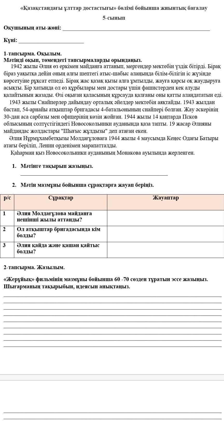 2. 1) Жауап: 1942 жылы Әлия өз еркімен майданға аттанып, мергендер мектебін үздік бітірді.