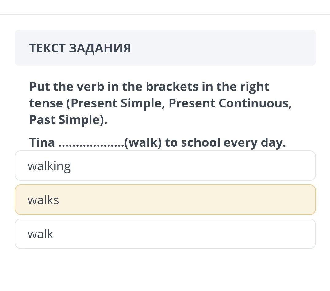 ТЕКСТ ЗАДАНИЯ Put the verb in the brackets in the right tense (Present Simple, Present Continuous, Past Simple). Tina ...... ........(walk) to school every day. walking walks walk