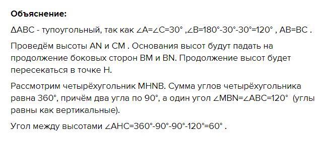 Угол при основании равнобедренного теругольника равен 30. Найдите угол между высотами , опущенными на боковые стороны этого треугольника.