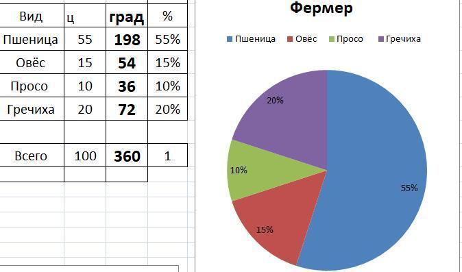 В фермерском хозяйстве площади,отведены под посевы зерновых,распределённые следующим образом:гречка-55%,просо-15%,рис-10%,пшеница-20%.представте эту информацию в виде круговой диограммы