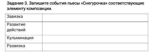 Задание 3. Запишите события пьесы «Снегурочка>> соответствующие элементу композиции. Завязка Развитие действий Кульминация Развязка.