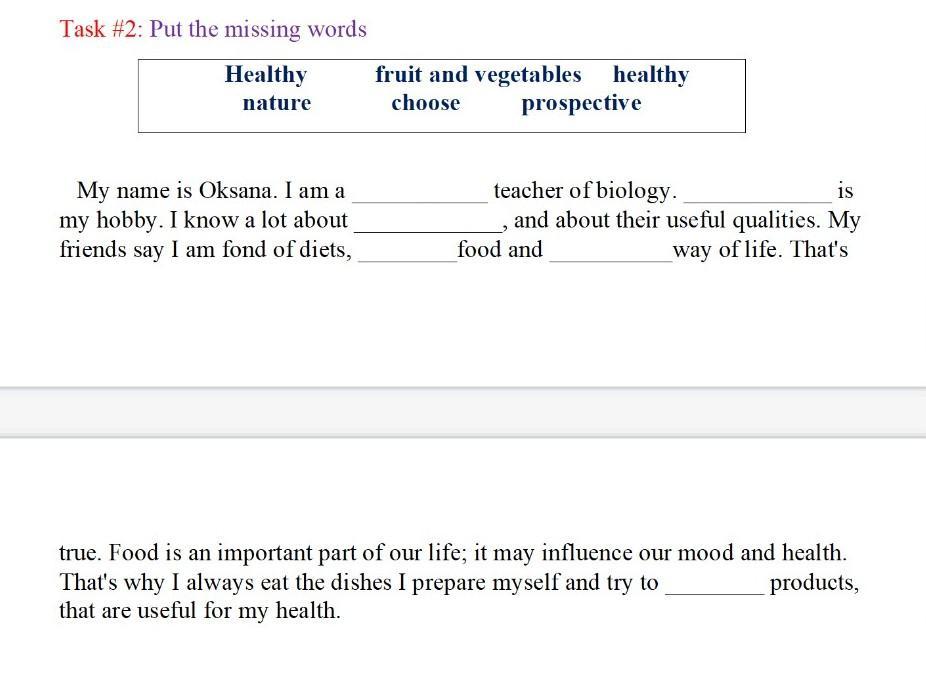 My name is Oksana. I am a prospective teacher of biology. Healthy is my hobby. I know a lot about fruit and vegetables, and about their useful qualities. My friends say I am fond of diets, natural food and healthy way of life. That's true. Food is an important part of our life; it may influence our mood and health.That's why I always eat the dishes I prepare myself and try to choose products, that are useful for my health.