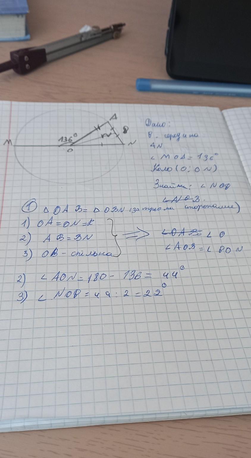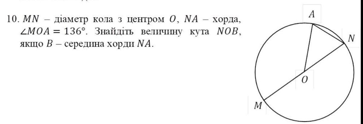 10.MN діаметр кола з центром 0, NA хорда, LMOA = 136°. Знайдіть величину кута NOB, якщо B - середина хорди NA.