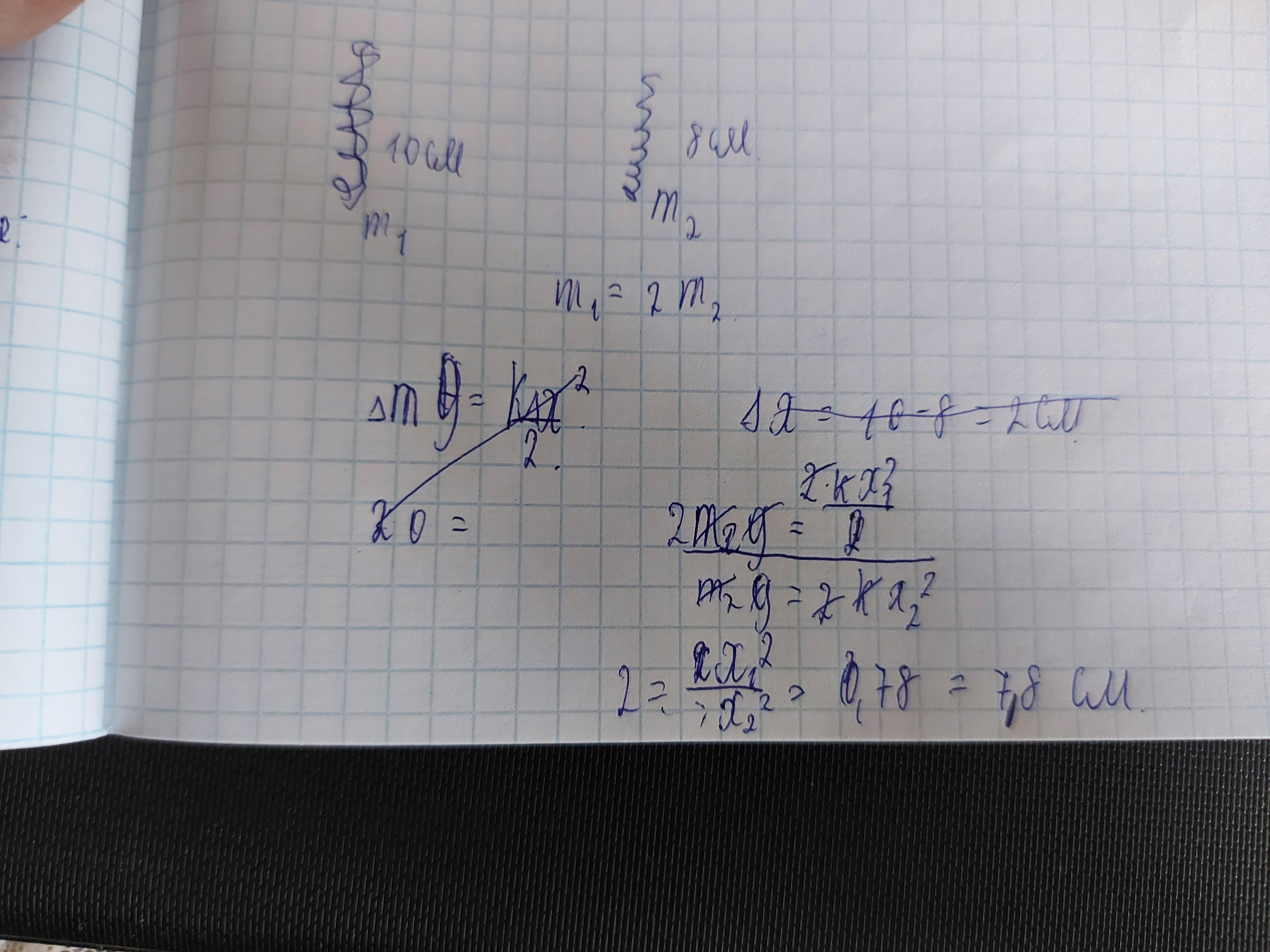 Первое тело висит на пружине ее длинна 10 см. Когда висит второе тело длинна пружины 8 см. Массы тел относятся как m1=2*m2. Найти длинну неразтянутой пружины.