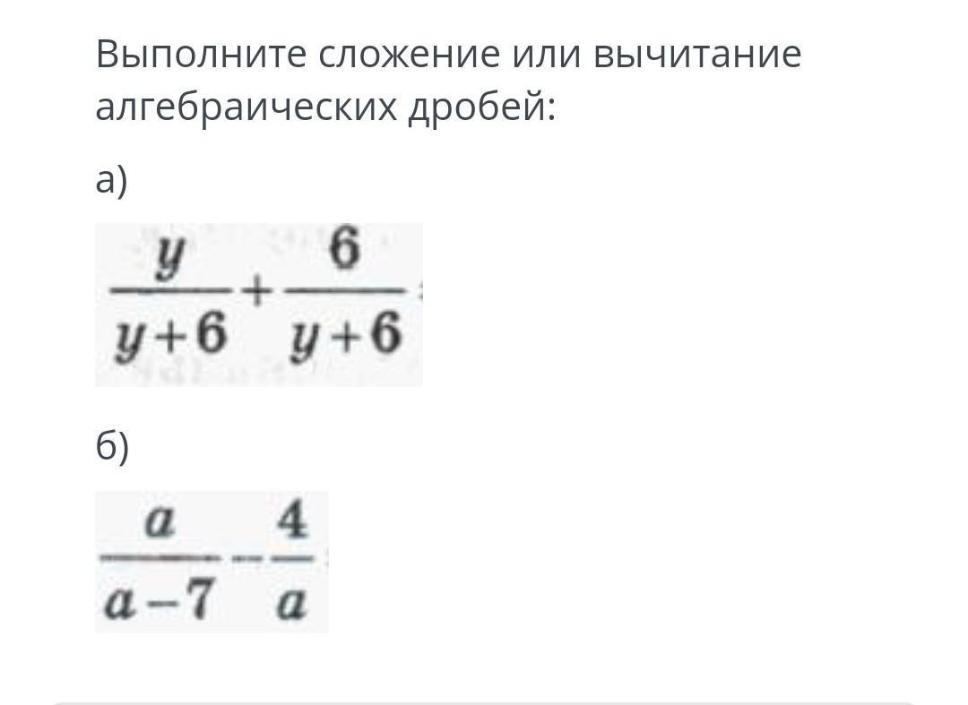 ДАЮ 40 БАЛЛОВ. выполните сложение или вычитание алгебраических дробей a) y/y+6 + 6/y+6