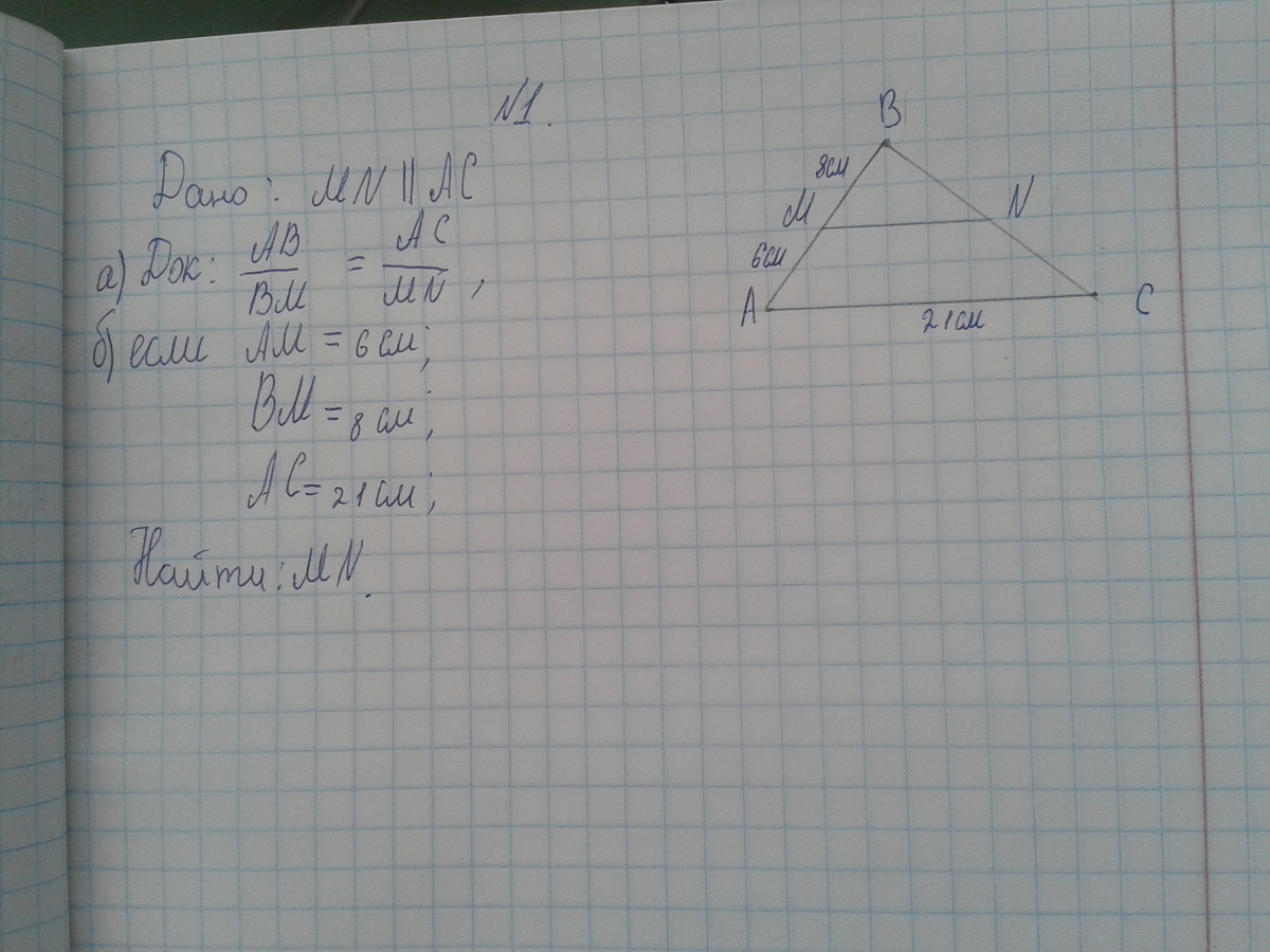 1-ая задача тривиальна: рассматриваешь сначала прямые MN, AC и секущие АВ, ВС: угол АСВ равен углу MNB, как односторонние, аналогично углы САВ и NMB равны, также потому что односоронние; угол В общий, следовательно треугольники АВС и MBN подобны по трем углам. Из подобия треугольников следует подобие соответствующих элементов, а значит АВ/МВ=АС/MN верно, подставляешь значения и получаешь, MN=12