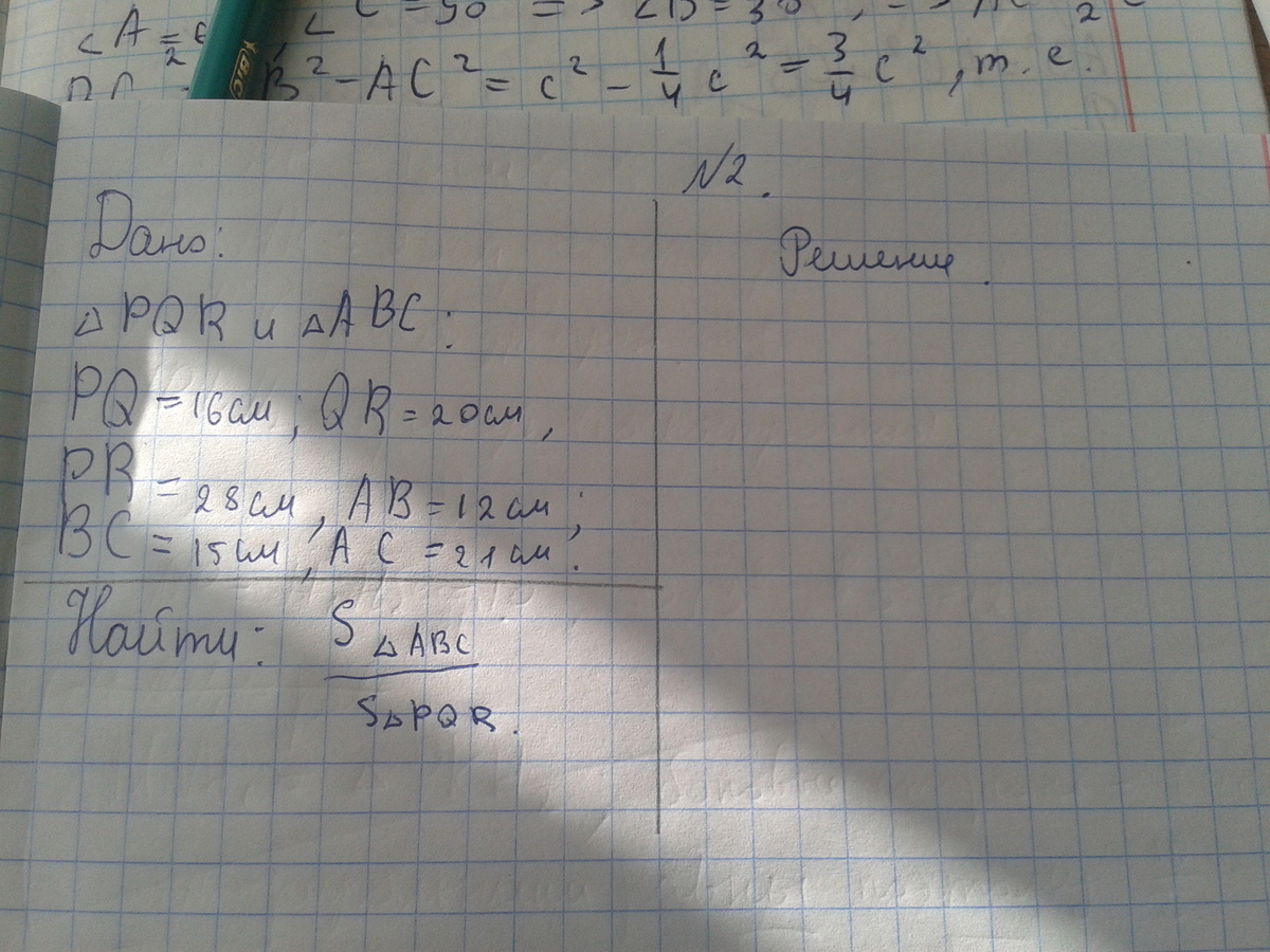 2. по формуле Герона считаешь площади и делишь одну на другую
