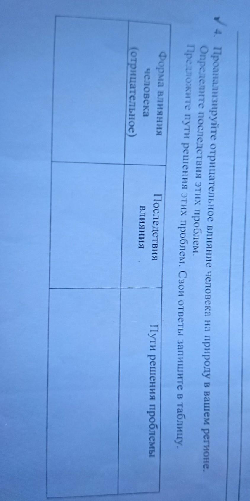 форма влияния человека: вырубка деревьев, трата воды или загрязнение окружающей среды: копоть, мусор.