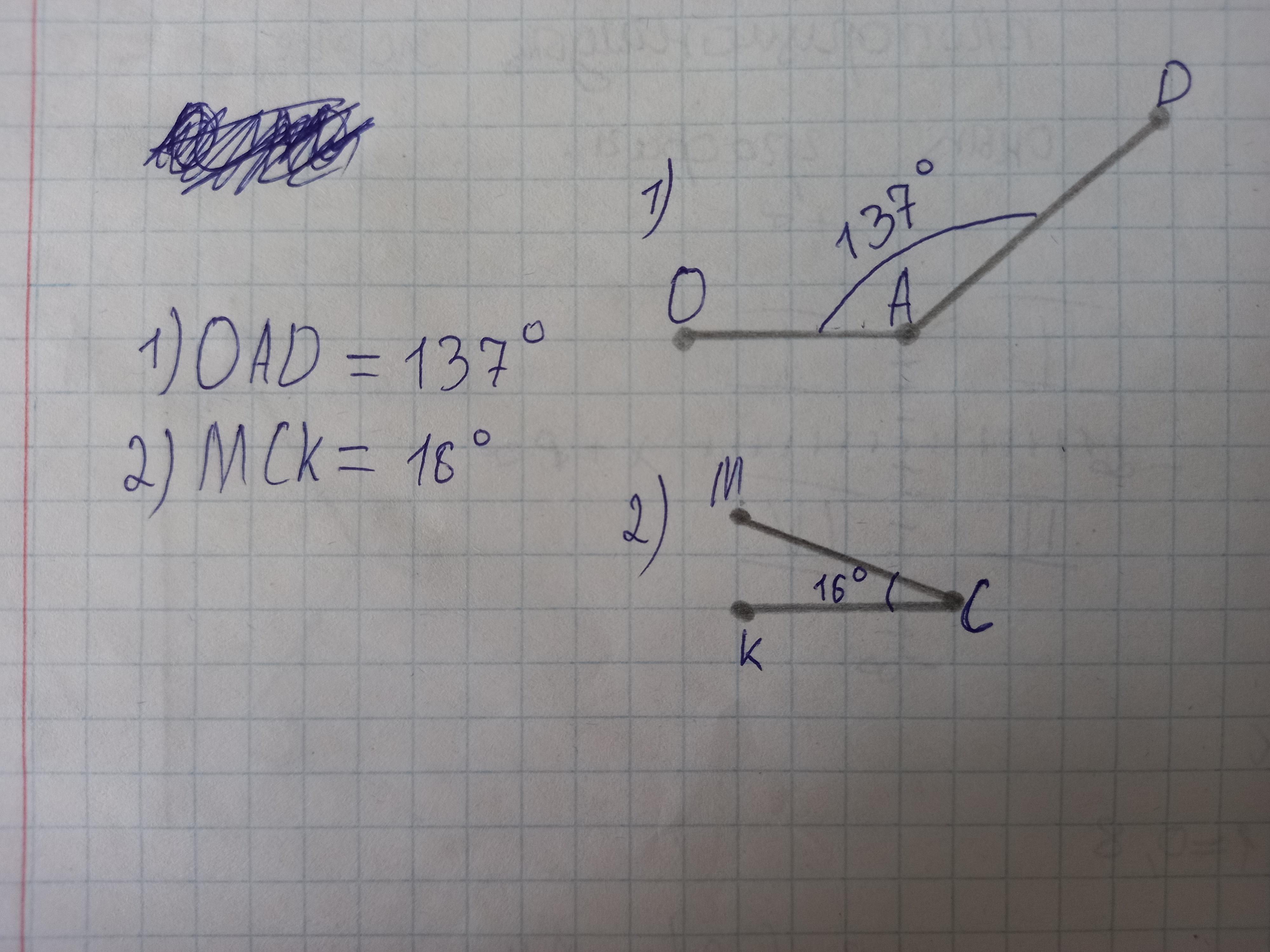 б)Построить углы OAD и MCK, если < OAD = 137°, < MCK = 16°​