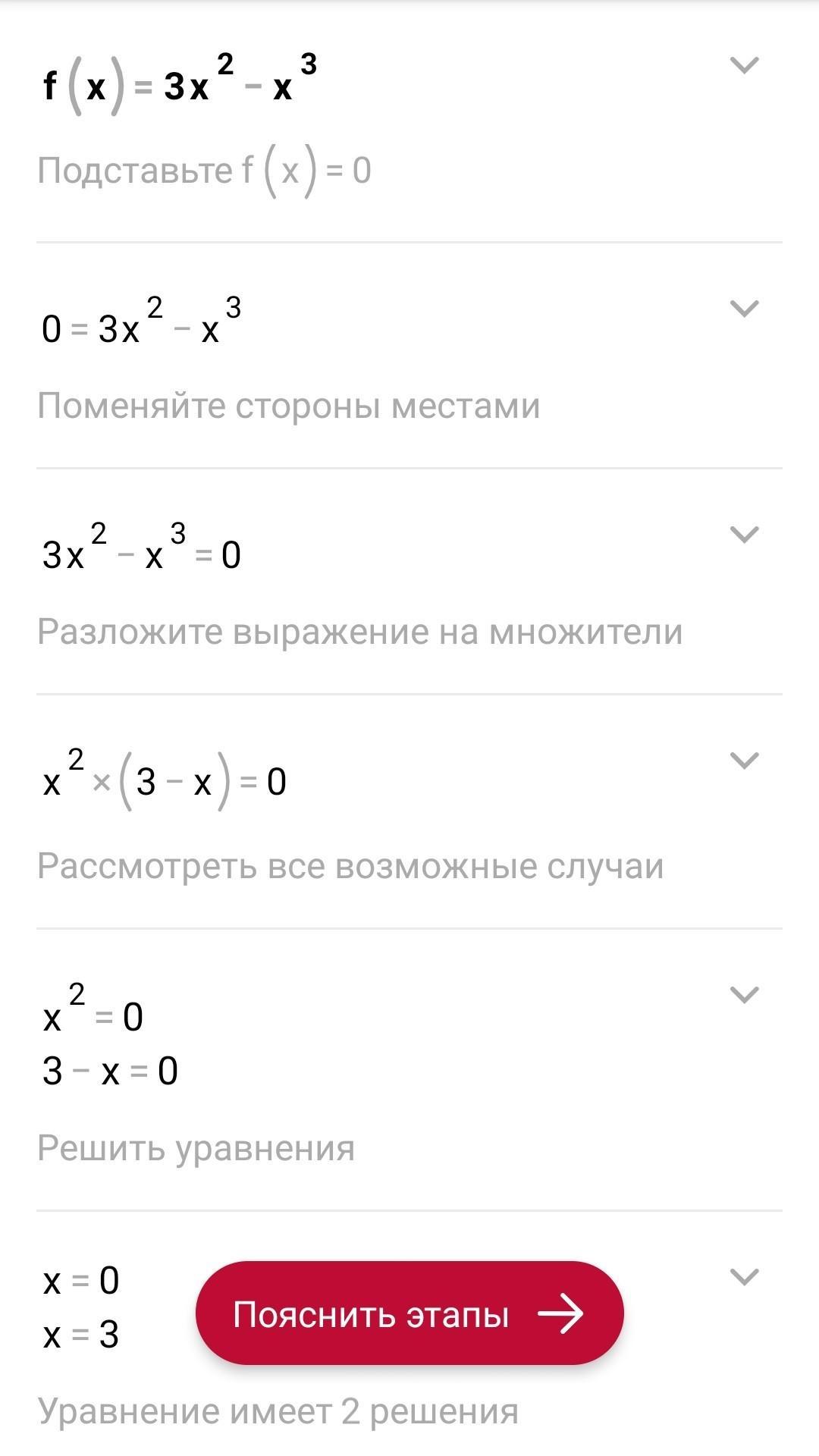 F(x)=3x²-x³. 0=3x²-x³. 3x²-x³=0. x²•(3-x)=0. x²=0. 3-x=0. x=0. x=3.