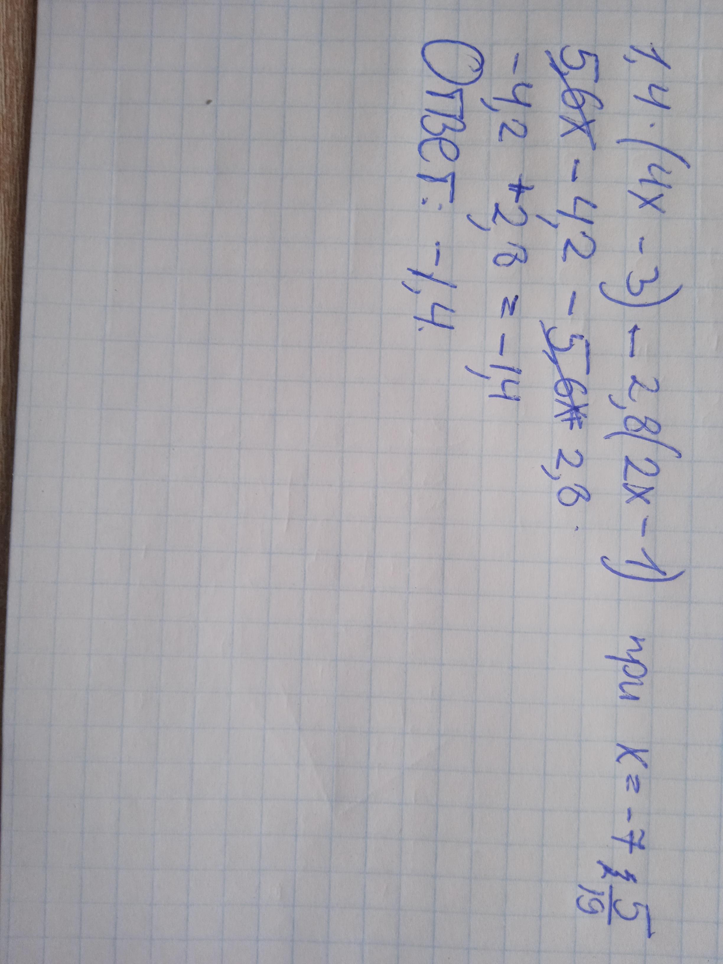 1,4(4x - 3) - 2,8(2x - 1) при x = -7 5/19 Найдите значение выражений! Помогите, пошаговое пояснение! Дам баллы