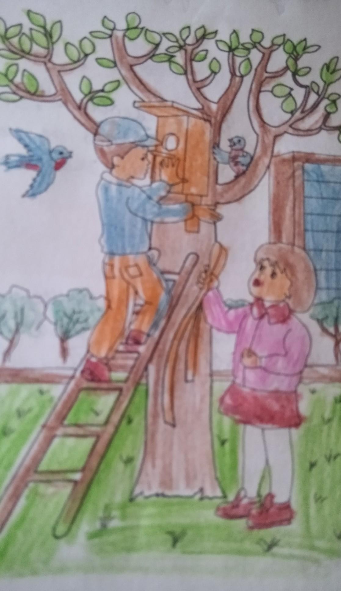 На рисунки изображери дети. Мальчик и девочка вешают скворечник для птичек. Птички же ждут когда можно уже будет заселиться в свой новый дом.