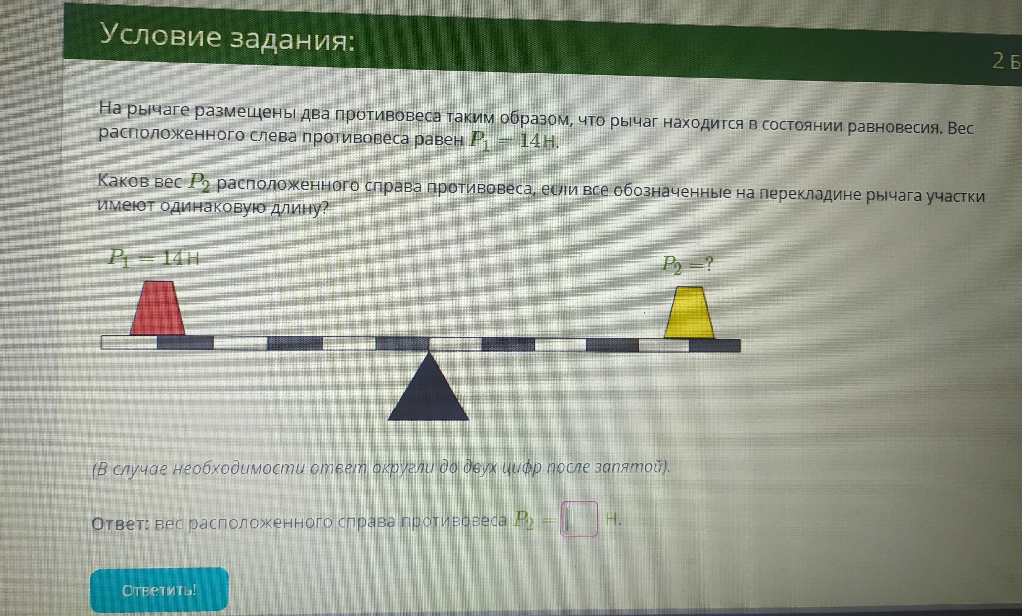 Каков все P2 расположенного справа противовеса, если все обозначенные на перекладине рычага участки имеют одинаковую длину?