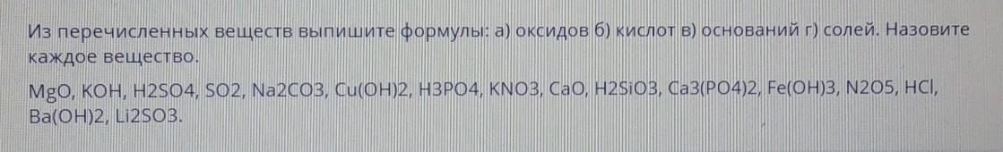 Из перечисленных веществ Выпишите формулы а )оксидов б) кислот в) оснований г) солей и назовите каждое вещество . Помогите срочно.8класс.сор