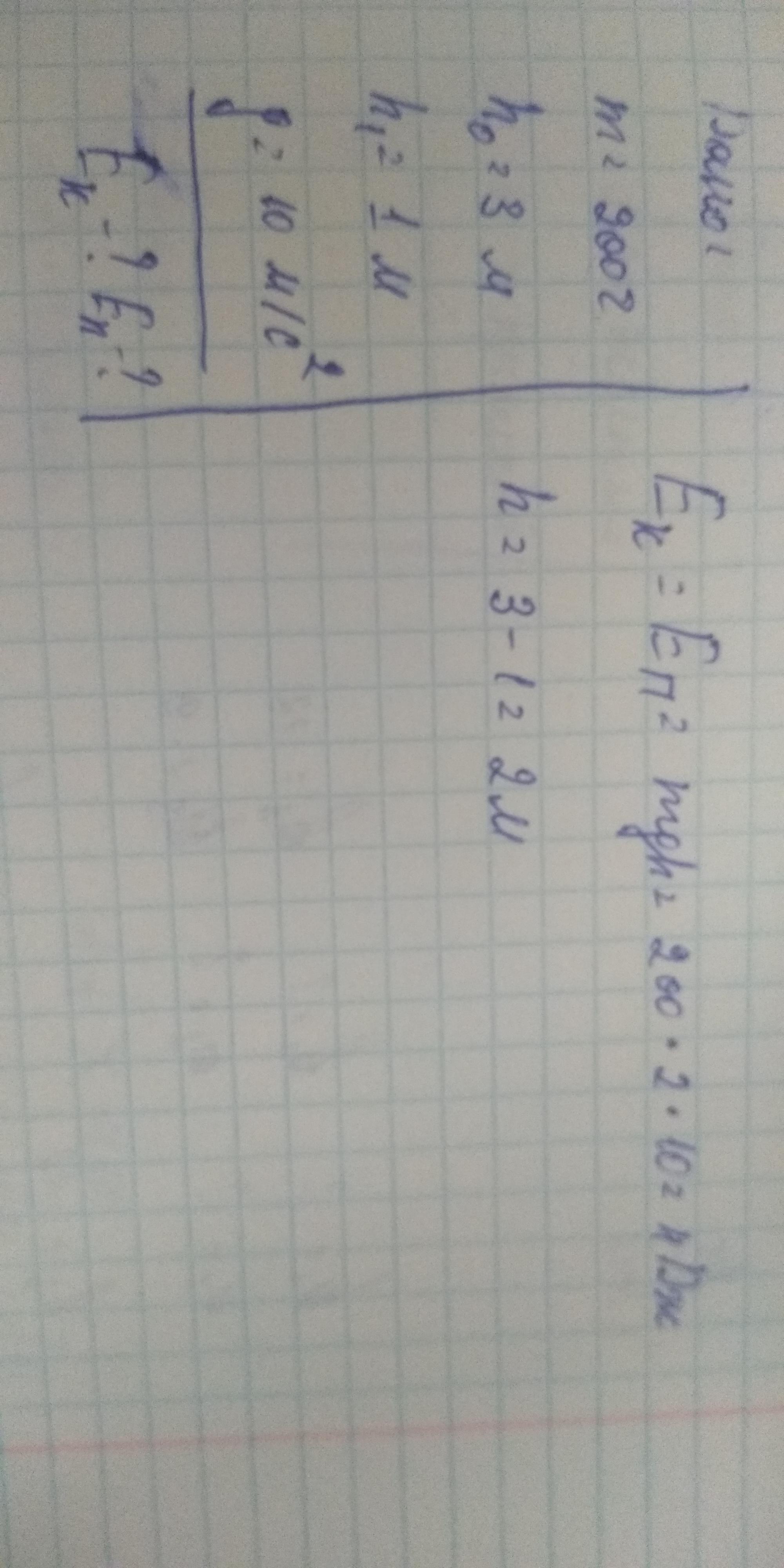 Яблуко масою 200г зібралося з гілки, яка перебуває на висоті 3 м від Землі. Визначте потенціальних та кінетична енергію яблука на відстані 1 м від Землі. Опір повітря не враховувати.