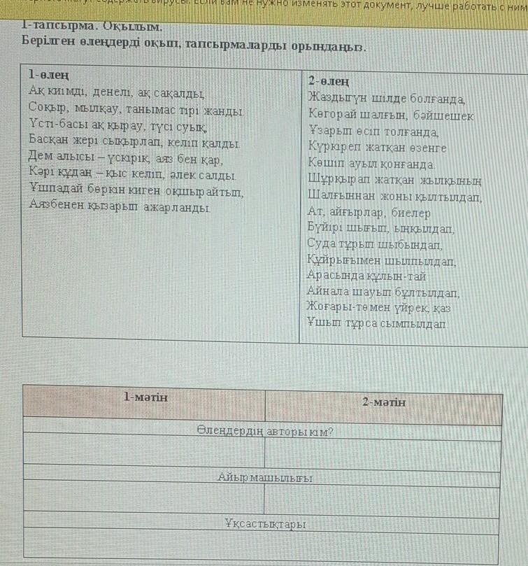 1 - тапсырма . Оқылым . Берілген өлеңдерді оқып , тапсырмаларды орындацьо . 1 - нлең Ак калмді , денелі , ақ сақалды Софір , скау , танымас прі жанды Үсті - басы ак кър ау , түсі суык Басқан жері сыпырлап , кетіп қалды Дем алысы - үскірік аяз бен кара Картудан - кыс келіп , алсксалды Ұшпадай боран Инген окшыр айтып , Аязбенен кызарып ажарланды 2 - елен Жаздыгүн шілде болғанда , Когоран шалгьрі , бәйшешек зарып есіп толғанда Күркіреп жатқан өзенге Кнт ауыл қонғанда Шүркырап жатқан жылкынын ІШалыннан жаны кыргындап , Ат , айғырлар , билер Бүйірі шығып , ыңкалдарт Суда тұрып шыбында . Куйрығымен Шилпылдат . Арасындағынтай АИн ала шатьш Бул тылдап , Жоғары - төмен үйрек , қаз Ұшып турса сыршылд аг. 1 - мәтін 2 - метін Өлеңдердің авторы кім ? айырмашылығы Ұқсастықтарьт