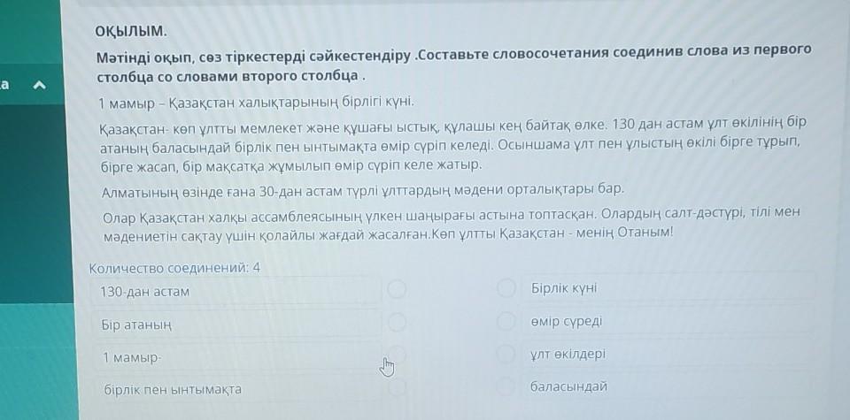 Мәтінді оқып, сөз тіркестерді сәйкестендіру .Составьте словосочетания соединив слова из первого