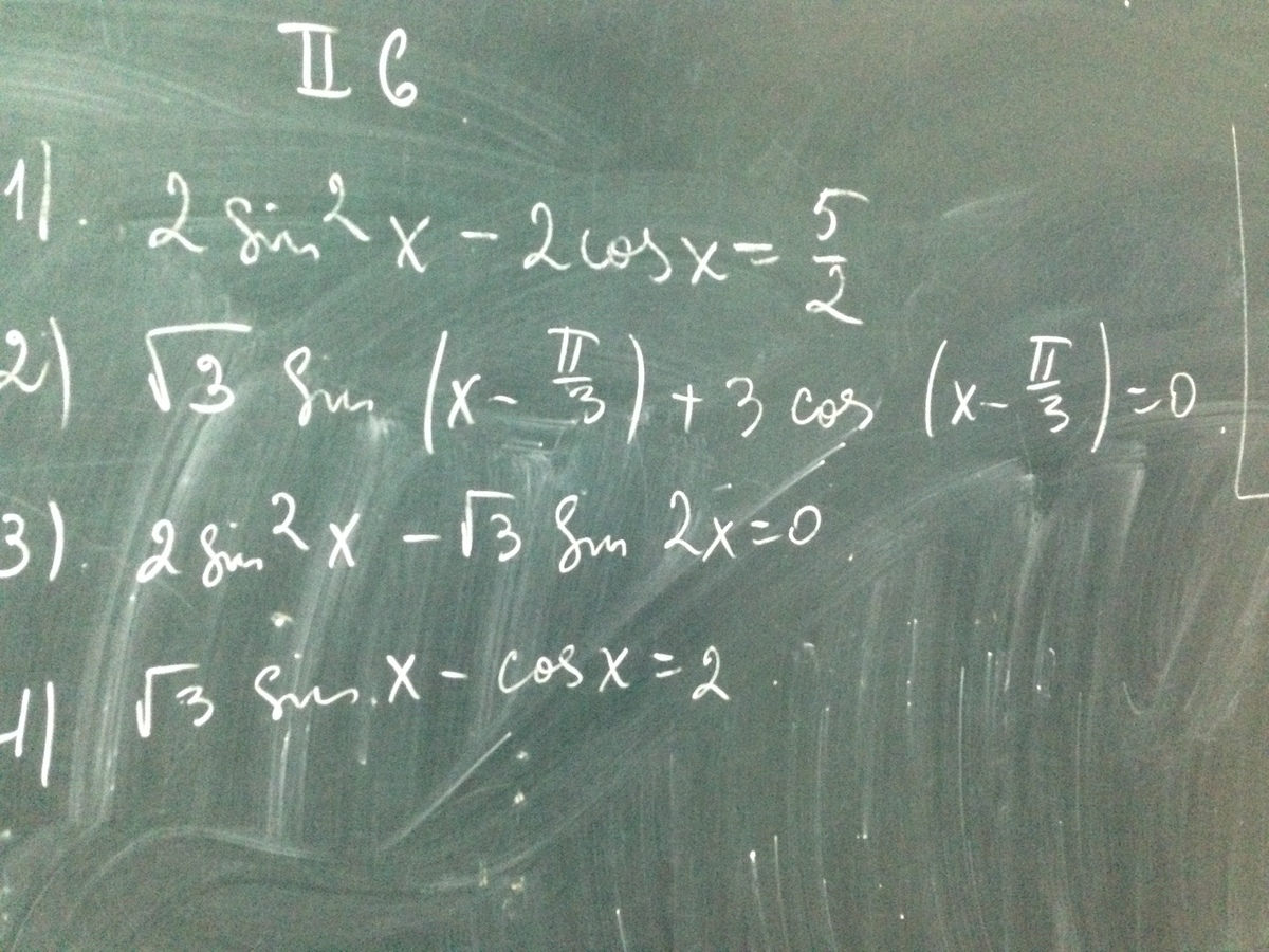 2)V3sin(x-p/3)+3cos(x-p/3)=0 t=x-p/3 v3sint+3cost=0 делим на 3косинус v3/3sint/cost=0 v3/3tg(t)=0 tg(t)=0 t=pn x-p/3=pn x=p/3+pn
