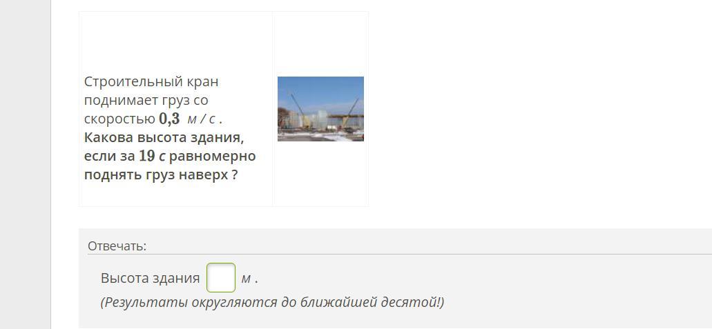 Строительный кран поднимает груз со скоростью 0,3 м / с . Какова высота здания, если за 19 с равномерно поднять груз наверх ?