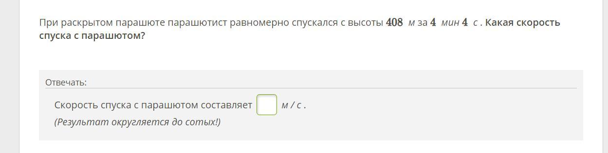 При раскрытом парашюте парашютист равномерно спускался с высоты 408 м за 4 мин 4 с . Какая скорость спуска с парашютом?