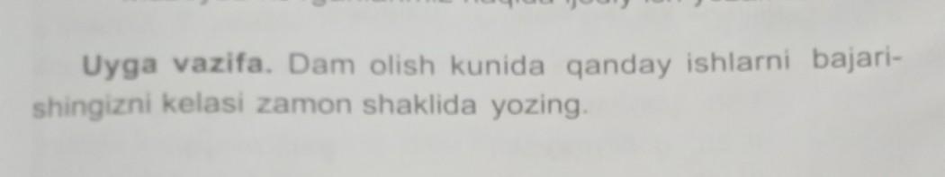 Uyga vazifa. Dam olish kunida qanday ishlarni bajarishingizni kelasi zamon shaklida yozing.