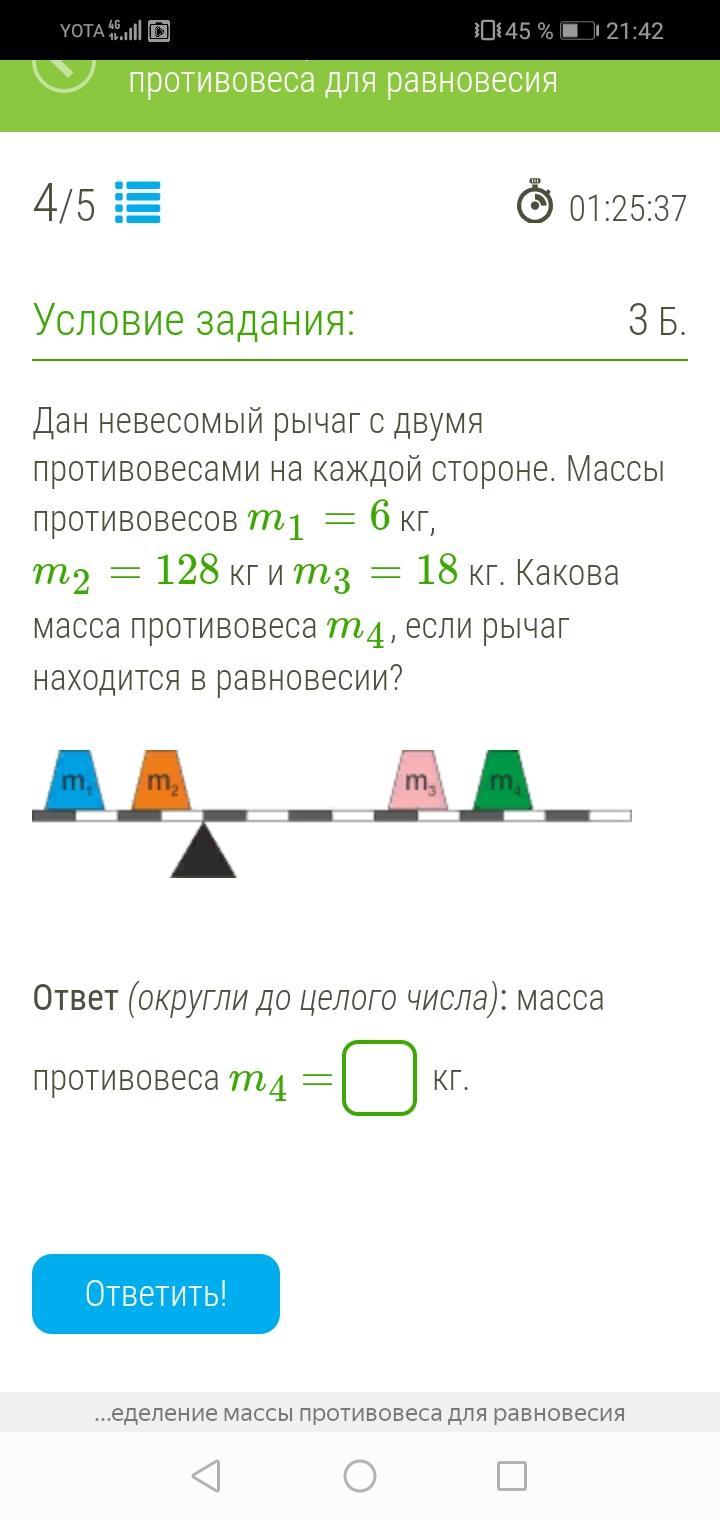 45 БАЛЛОВ!!! Дан невесомый рычаг с двумя противовесами на каждой стороне. Массы противовесов m1=6 кг, m2=128 кг и m3=18 кг. Какова масса противовеса m4, если рычаг находится в равновесии?