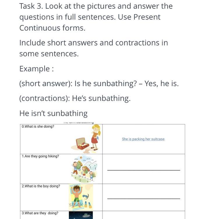 look at the pictures and answer the questions in full sentences. Use present continuous forms