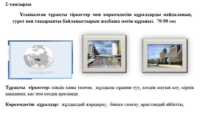 Ұсынылған тұрақты тіркестер мен көркемдегіш құралдарды пайдаланып, сурет пен тақырыпты байланыстырып жазбаша мәтін құраңыз. 70-90 сөз