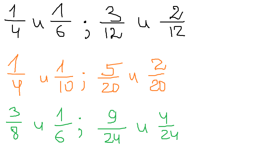 Привидите дроби к общему знаменателю 1/4 и 1/6, 1/4 и 1/10 3/8 и 1/6
