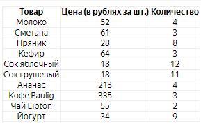 В таблице записано, сколько и какого товара было куплено. С помощью одной из изученных вами функций электронных таблиц определите суммарную стоимость покупки.