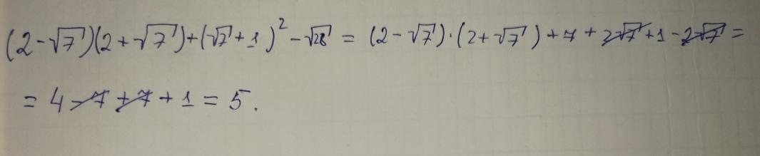 (2-√7)(2+√7)+(√7+1)²-√28=(2-√7)(2+√7)+7+2√7+1-2√7=4-7+7+1=5