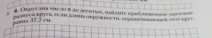 округлив число πдо десятых ,найдите приблежонное значение радиуса круга,если длина окружности ,ограничивающей этот круг,равна 37,2 см(ЕСТЬ ФОТО)