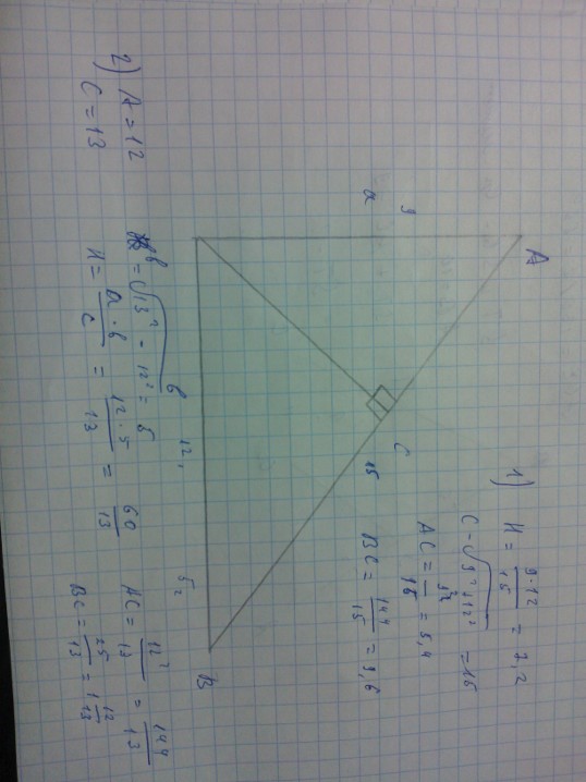 Пусть с-гипотенуза, A,B-катеты, H-высота, проведенная к гипотенузе,Ac, Bc-проекции катетов на гипотенузу прямоугольного треугольника. Найти:1)C,H.Ac,Bc, если А=9 см, B=12 cм; 2)B,H,Ac,Bc, если А=12 см, С=13см