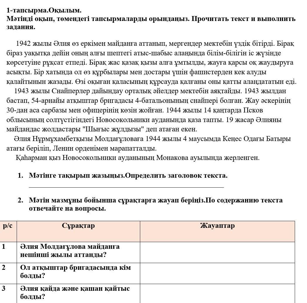 1. Мәтін тақырыбы : Әлия Молдағұлованың өмірбаяны.