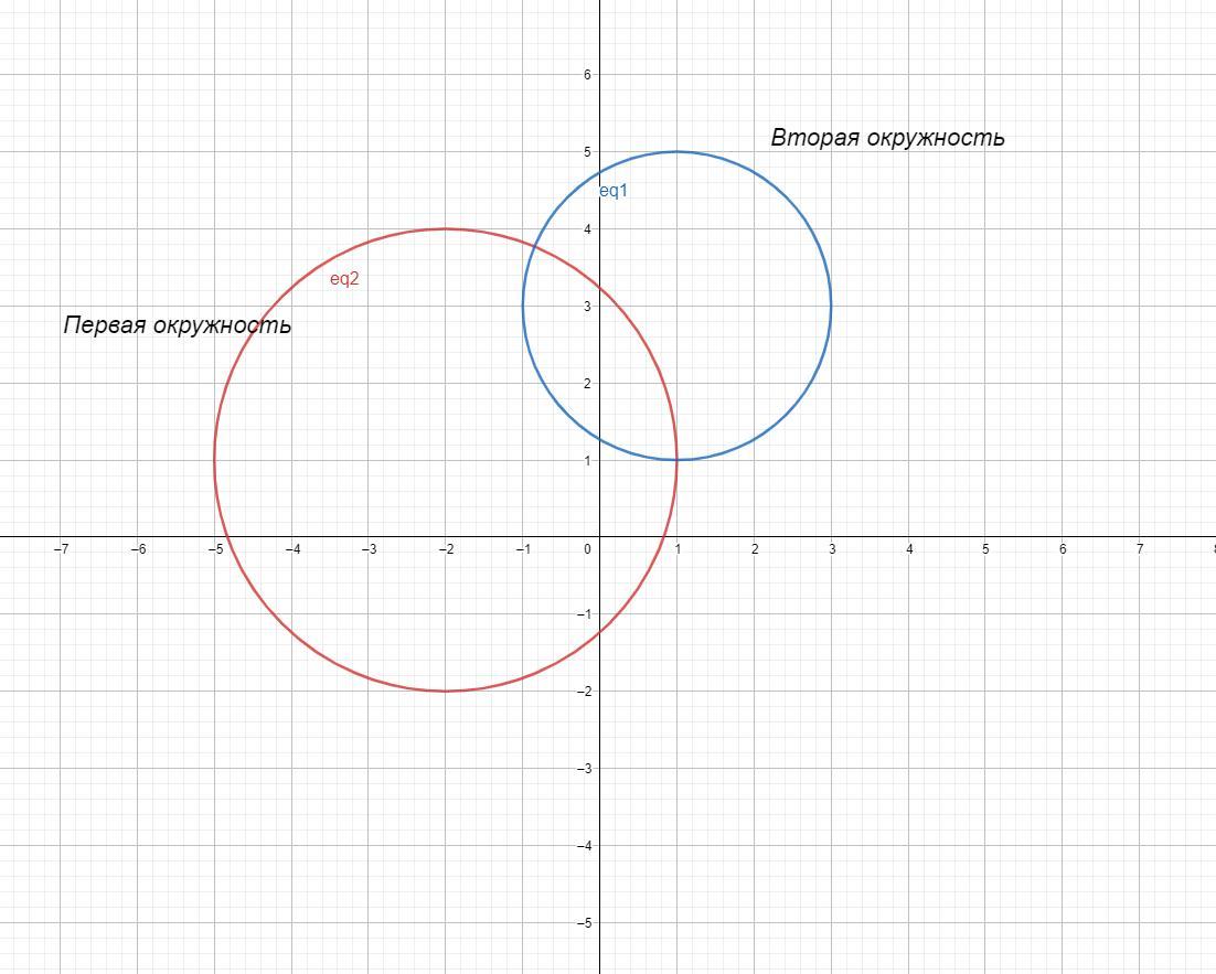 Из построения выясняем, что эти две окружности пересекаются в двух точках, и центр второй окружности расположена на точке с большими координатами от первой по обеим осям.