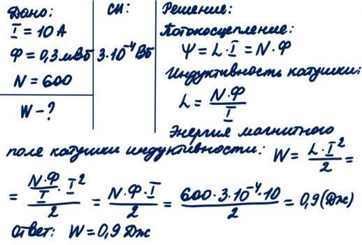Электрический ток силой 10 А протекает через катушку индуктивности. Определите энергию поля катушки, если магнитный поток через один её виток составляет 0,3 мВб, а общее число витков равно 600.