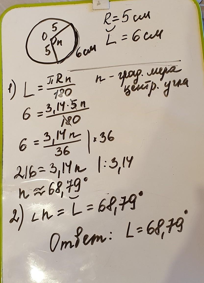 где L - длина дуги, n - градусная мера центрального угла, образованного между двумя радиусами равных 5 см.