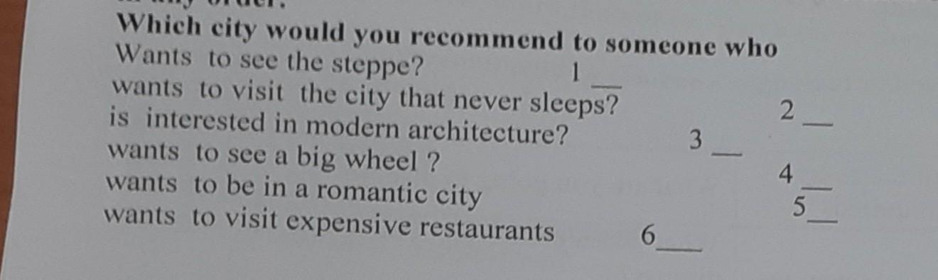 Ответ:1. Ulaanbaatar 2.New York 3.Dubai 4.Las Vegas 5.Paris 6.New York city