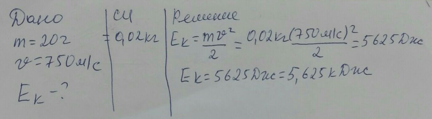 Пуля, масса которой 20 г, вылетает из винтовки со скоростью 750 м/с. Какова кинетическая энергия пули?