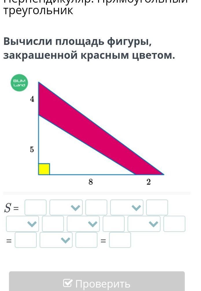S большого треугольника ( белая + красная области)= (4+5) *(8+2)/2=45