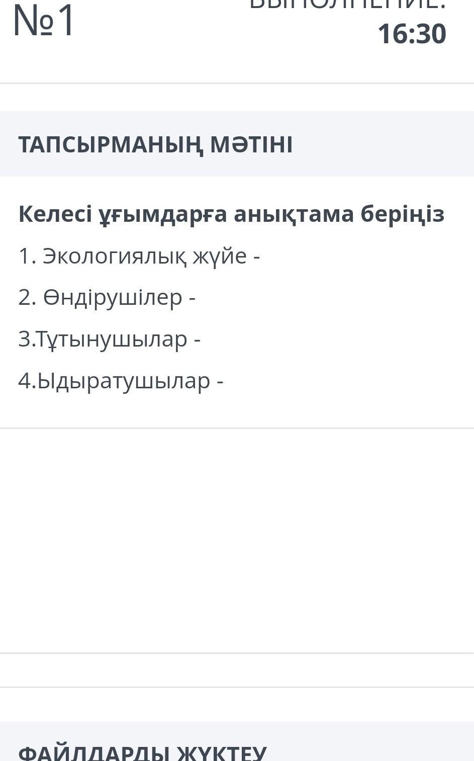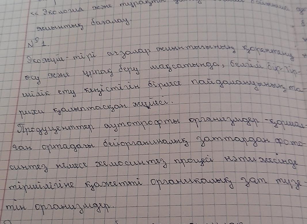 1.Экологиялық жүйе, экожүйе – тірі ағзалар жиынтығының қоректену, өсу және ұрпақ беру мақсатында, белгілі бір тіршілік ету кеңістігін бірлесе пайдалануының тарихи қалыптасқан жүйесі. Экожүйе құрамына организмдер де, табиғи орта да кіретін тірі табиғаттың негізгі функционалдық бірлігі болып табылады.