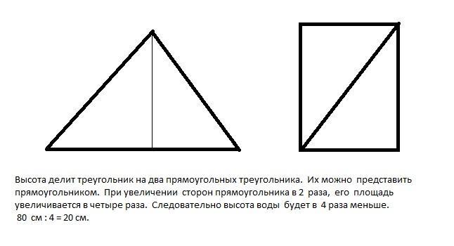 в аквариум имеющий форму правильной треугольный призмы налилии воду уровень воды достигает 80 см на какой высоте будет находится уровень воды если ее перелить в аквариум такой же формы у которого сторона в 2 раза больше чем у первого