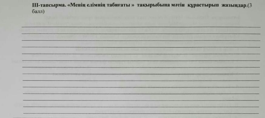 Біздің еліміздің табиғаты өте ерекше. Жыл мезгілінің қай тұсын алсаң да, я қаламыз, я ауылымыз жайнап тұрады. мысалы қыс мезгілін алсақ, терең тыныс алатын таза ауа, ақ көрпесін жамылған жер, екі беттері алмадай боп шана тепкен балалар. Ал, енді көктемге мезгіліне сипаттама берсек, жан-жақтың бәрі көгеріп, жер астынан бәйшешегіміз бүршік атып шығады, Жаз нағыз жеміс-жидектің пісіп, балалардың мәз-мейрам болатын уақыты. Күзге тоқталсақ, бұл жыл мезгілі әсіресе ақын аға-апаларымыз тілін түсіне білетін алтын уақыт.
