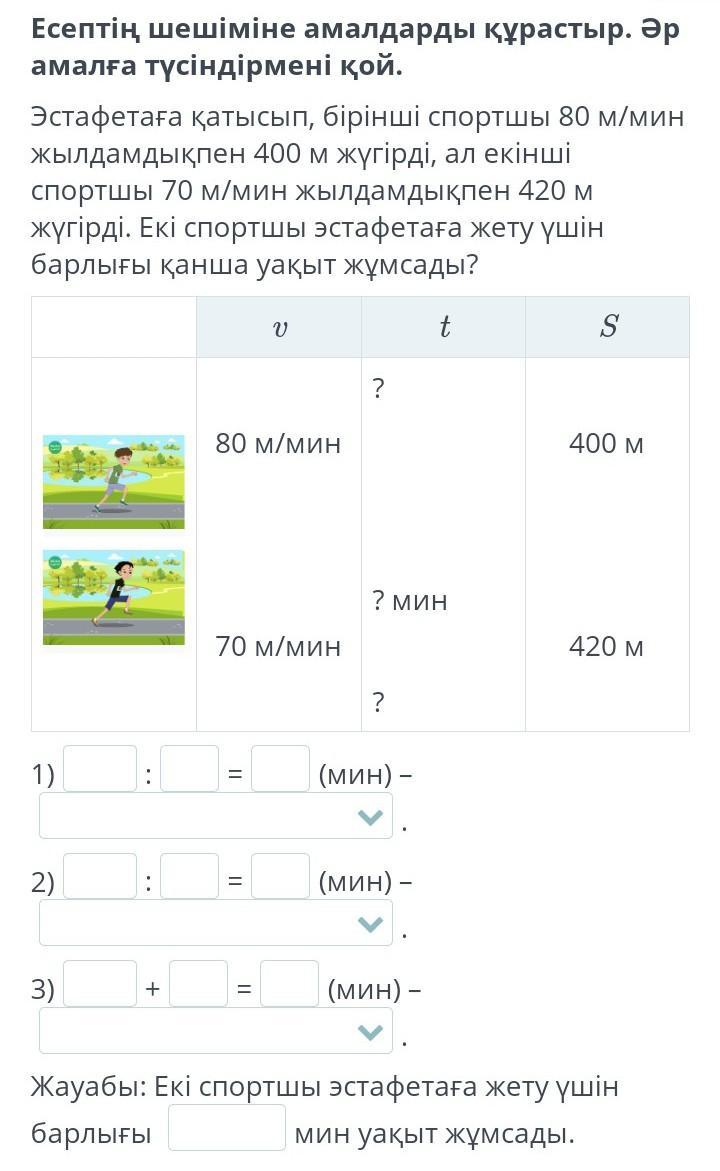 Эстафетаға қатысып, бірінші спортшы 80 м/мин жылдамдықпен 400 м жүгірді, ал екінші спортшы 70 м/мин жылдамдықпен 420 м жүгірді. Екі спортшы эстафетаға жету үшін барлығы қанша уақыт жұмсады?
