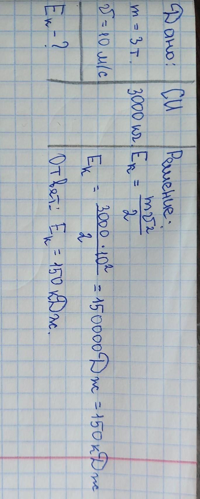 1.Автомобиль массой 3т движется со скоростью 10 м/с. Какова кинетическая энергия автомобиля?