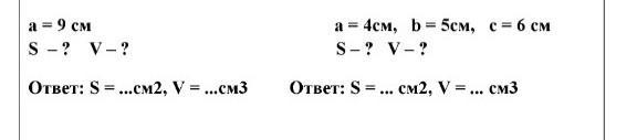 если я правильно поняла то там нужно найти площадь и объем куба и прямоугольного параллелепипеда