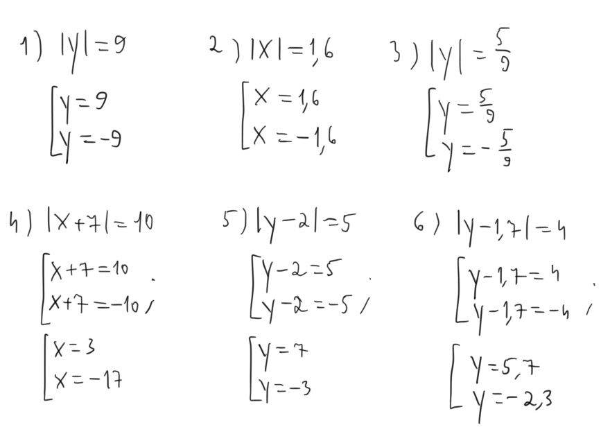 x-2 = 5 или x-2 = -5. Но уравнение |x|=-4 не имеет решений, потому что модуль - всегда положительное число. Решаем эту совокупность двух уравнений, и находим корни. Решение на картинке.
