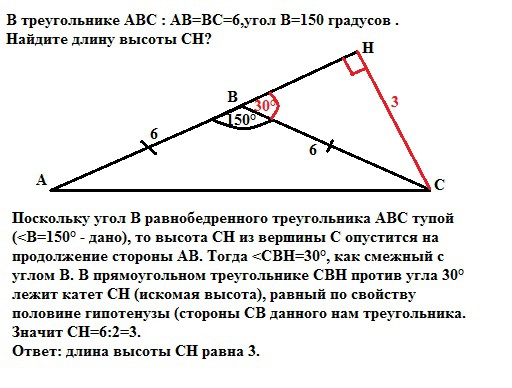 Поскольку угол В равнобедренного треугольника АВС тупой (<B=150° - дано), то высота CH из вершины С опустится на продолжение стороны АВ. Тогда <CВH=30°, как смежный с углом В. В прямоугольном треугольнике СВН против угла 30° лежит катет СН (искомая высота), равный по свойству половине гипотенузы (стороны СВ данного нам треугольника. Значит СН=6:2=3.