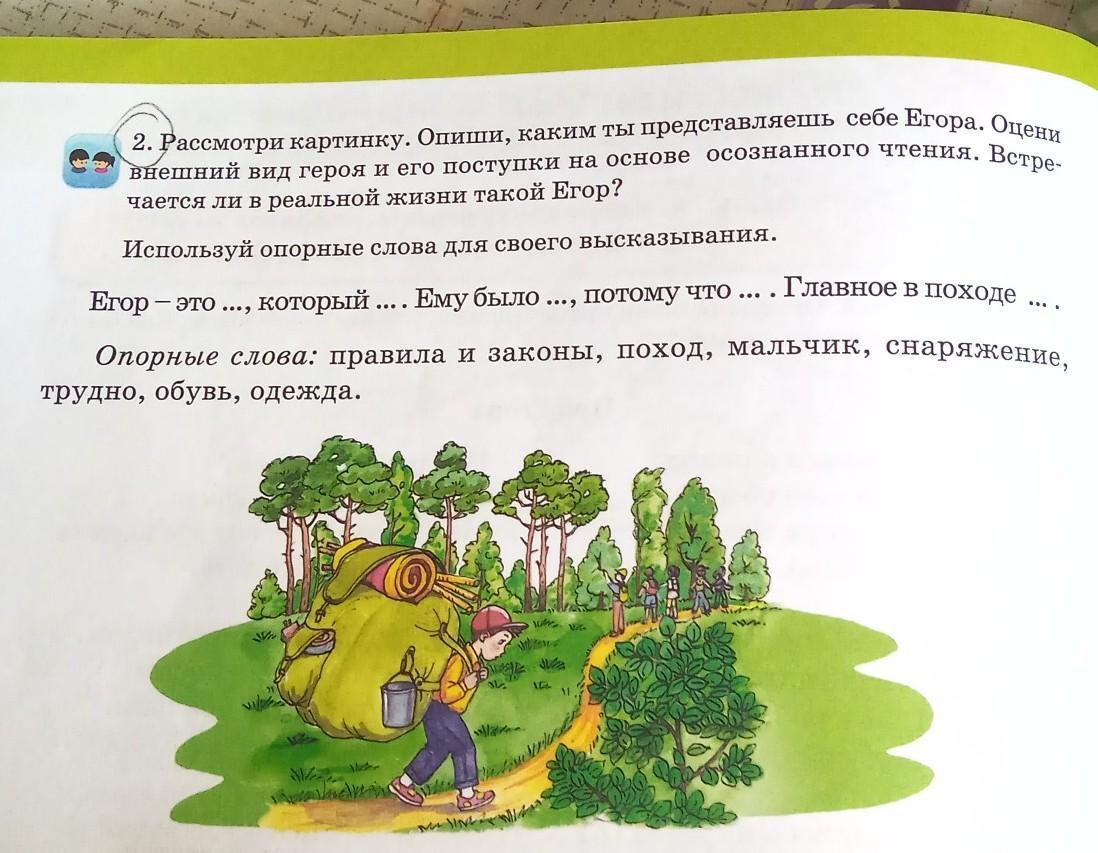 Егор-это мальчик, который прошёл в поход. Ему было трудно, потому что снаряжение было тяжёлым. Главное в походе-это соблюдать правила и законы.